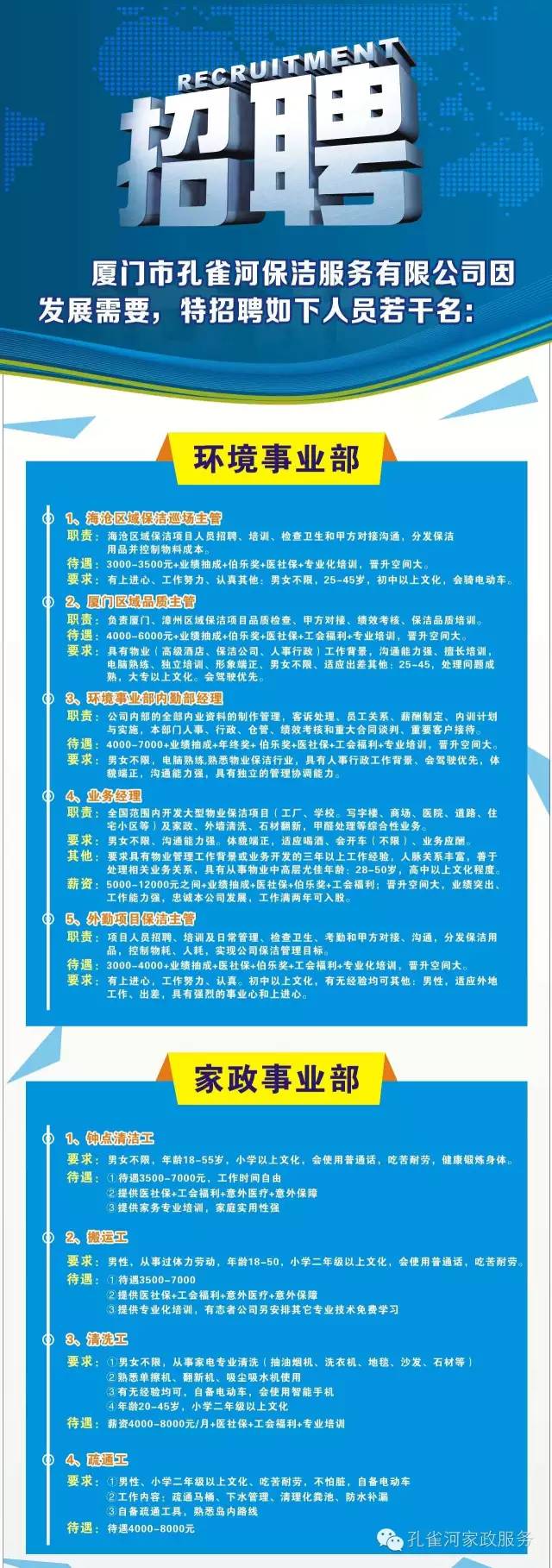 因公司規(guī)模不斷的擴大,業(yè)務(wù)不斷的增多,現(xiàn)廈門孔雀河保潔服務(wù)有限公司向社會有志之士招收一批人才。廈門孔雀和重金招聘